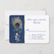 Chic peacock feather wedding response RSVP card, with lovely graphics of a silver tone flourish up the left side with a colorful eye of a peacock feather and three little pearls, against a blue damask background. The right part of the card is done in white, with blue custom text ready to personalize for your special day. Matching products available.