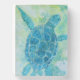 a traditional watercolor artwork of a deep sea turtle in blue and green colors on a wooden box sign
