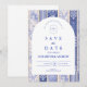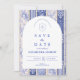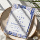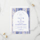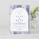 A timeless blue and white design inspired by classic Delft porcelain and French toile patterns. The patchwork tile border combines delicate florals, stripes, and ornamental motifs that evoke vintage European ceramics. A soft arched panel in the center keeps the layout refined and elegant while allowing the details of the porcelain-inspired pattern to frame the celebration beautifully. Perfect for couples planning a sophisticated blue and white wedding with traditional European charm.