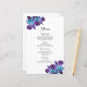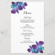 Purple and turquoise blue Dendrobium orchid wedding menu. Simple wedding menu design that features a beautiful orchid variety called a blue dendrobium. It is teal / turquoise in color paired with violet and royal purple. A great flower choice for peacock wedding color theme.