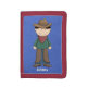 Keep your cash and credit cards handy with this western style wallet. It features a faux denim on the flap. A cute little brown haired cowboy stands front and center. You can customize the name at the bottom.