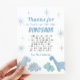 Cute dinosaur theme baby shower thank you template card featuring pastel blue colored tiny baby dinosaurs. The text says "Thanks for showering our tiny dinosaur." The default message thanks the guests for attending the shower and for the gift.