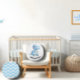 This cute cushion for a baby or child’s room can be displayed either side. A geometric design one side gives a modern flair and the other features a friendly dinosaur with customizable wording.