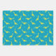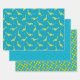 A set of three coordinated dinosaur patterned gift wrap sheets.