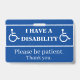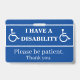 Blue Badge. I have a disability. Please be patent. Alert others to unseen disabilities. Give this to dad, brother, grandpa, friend, child, more. They can wear in public to let everyone know they may need a little more time than others. Personalize, Erase the back and add your own words. Can add a name, emergency phone number, or alert for illness or condition. Choose edit. Thoughtful gift.