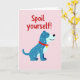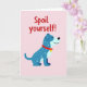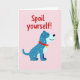 This card features a stylized blue dog resting calmly against a soft pastel pink background, giving the scene a cozy, affectionate mood ❤️. The dog’s body blends deep and light blues, sprinkled with white spots of different sizes that create a gentle, dappled look. Its eyes are closed and its mouth curves into a small smile, like it’s savoring a quiet moment the way a close friend might relax beside you. A bright red collar circles its neck, and a yellow tag hangs at the center, adding a warm pop of color. Near the top of the design, the words “Spoil yourself!” appear in red lettering, set above the dog and easy to read. The simple shapes and smooth edges keep the focus on the dog’s peaceful pose and the soft contrast between cool blues and rosy pinks 🌼. The red text sits above the dog on the pink field, while the collar and tag stand out sharply against the blue fur. The background stays a uniform pastel pink with no extra scenery, framing the spotted dog and its red collar clearly.