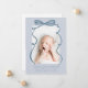 Whimsical and sweet birth announcement card featuring hand drawn photo frame of blue line with a bow at the top.