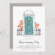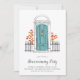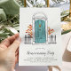 Charming housewarming party invitation features a sketched door illustration in aqua blue framed by bricks, with your custom event type (shown with "housewarming party") in chic calligraphy script lettering. Personalize with your celebration details beneath.