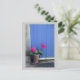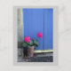 A pot of bright pink geraniums in front of the vibrant blue door of a little house in Culross, Fife, Scotland. You can add your own text and change the color of the background on the postcard to suit.