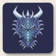 Blue dragon coaster featuring a digital illustration of this cool magical creature's head with horns in purple and blue colors over dark blue background.