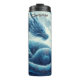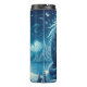 A magnificent blue dragon with intricate, swirling patterns on its scales is curled up on a snowy landscape. A massive, bright full moon dominates the dark night sky filled with stars, and the dragon exhales a frosty breath.