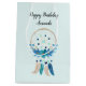 A birthday gift bag with a pretty watercolor dreamcatcher. Blue, turquoise and cream colors. Decorated with feathers, beads and flowers.