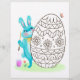 A fluffy blue Easter bunny gets ready to paint a giant easter egg.