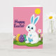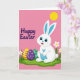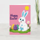 This greeting card features a stylized white rabbit with blue-edged ears and big sky-blue eyes, sitting on a green patch of grass while gently holding a pale blue egg 🐰. Nearby, three decorated eggs stand close together like friendly companions: one yellow with stripes, one deep purple with white dots, and one teal with lighter blue circles. Small white flowers scatter across the grass, adding a soft, springtime touch that feels like a sweet shared moment. The background is a strong fuchsia tone, making the scene feel bright and lively without being busy. Near the top, a round yellow sun-like shape glows, and a seasonal greeting appears above the rabbit in indigo lettering, centered and easy to spot 🌷. The rabbit’s relaxed pose and the way the eggs cluster together suggest warmth and closeness, like friends gathering for a spring celebration. Indigo text sits near the upper area against the fuchsia background, while the yellow circle hovers nearby like a simple sun. White blossoms dot the lower foreground around the rabbit’s feet and the eggs.