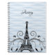 Jot down important notes or reminders with a Blue Eiffel Tower Flourish Notebook. Notebook design features the Eiffel Tower adorned with elegant flourishes against a blue wavy background. Additional colors available with this design as well. This item may be personalized with a name or monogram of your choosing. Please contact me if you need assistance with personalization.