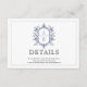 Blue vintage floral crest monogram and border wedding details enclosure card with QR code. This enclosure card showcases a romantic, vintage-inspired design perfect for wedding details. A blue floral crest, artfully incorporating the couple's monogram, takes center stage. The word "DETAILS" appears below in elegant, matching black typography. There is a thin blue border around it. The reverse side features a convenient QR code for guests to access additional information.
