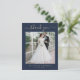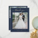 Elegant, stylish and simple wedding thank you template 2 photo card with gold script on a beautiful blue background. Design features an elegant thank you script with editable photo, name of bride and groom with wedding date on front of card. Back of card features a second editable photo and message. Easy to customize text and photos. Get yours today!