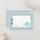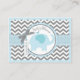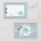 Grey and white chevron print with blue accents with bird perched on elephant with bow-tie and a 3D-look polka-dot bow place card design for a baby shower.