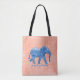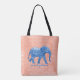 All over print tote bag done in a light coral distressed pattern, with graphics of a blue elephant. Blue text reads pachyderm and can be personalized to read what you want.