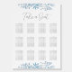 Elegant, boho wedding seating chart sign features dusty blue eucalyptus leaves. Personalize with your guest's name with the easy to edit template featuring a romantic script font and modern sans serif font.