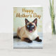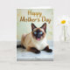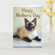 This card features a close-up of a point-colored house cat with a creamy fawn coat and deep brown ears, muzzle, paws, and tail, posed on a glossy, marble-veined surface. Soft, diffused light gives the fur a gentle glow, and the cat’s forward gaze feels like a quiet, affectionate hello ❤️. Near the top, the words “Happy Mother’s Day” appear in golden lettering, standing out clearly against the softer background tones. Behind the cat, the background is softly blurred in muted greens and warm yellow touches, like out-of-focus leaves and sunlight. The cat’s bright blue eyes sparkle with curious attention, adding a friendly, tender mood to the portrait. A tiny pink tongue peeks out from its dark muzzle, giving the expression a sweet, slightly silly charm 🌼. Fine white whiskers fan out from the face, and the polished surface beneath shows pale gray veining with a subtle shine.