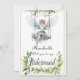 Will you be my bridesmaid card with a darling blue Fairy with beautiful wings on a swing covered with leaves and vines. Bridesmaid text is done in a green watercolor effect surrounded by a leafy vine. Personalize with each bridesmaid's name. Choose your favorite font and color.