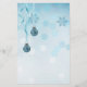 Christmas illustration in blue: Blue glitter ornaments with curled ribbons on a white-blue bokeh background.