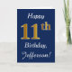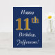 This simple birthday card design features the message "Happy 11th Birthday", with the "11th" having a faux gold-like appearance. It also features a customized name, and a dark blue background. It could be given to somebody who is celebrating their eleventh birthday.