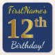 Blue, Faux Gold 12th Birthday + Custom Name Square Paper Coaster