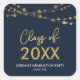 This elegant Graduation Party square sticker that you can add your graduating year features strings of lights and the word "Class of" in faux gold foil against a dark blue background. Check out other matching invitations and postage stamps here https://www.zazzle.com/collections/119637323833384053