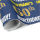 This wrapping paper design features a message like "FIRSTNAME’S 60th BIRTHDAY!", with the "60th" having a faux/imitation gold-like color appearance, and with the name and "BIRTHDAY" in a fun, bold font. The name is customizable, and the background is colored blue. Wrapping paper like this could perhaps be used when wrapping birthday gifts being given to somebody in celebration of their sixtieth birthday. [~Z0000209]