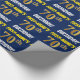 This wrapping paper design features a message like "FIRST-NAME’S 70th BIRTHDAY!", with the "70th" having a faux/imitation gold-like color appearance, and with the name and "BIRTHDAY" in a fun, bold font. The name is customizable, and the background is colored blue. Wrapping paper like this could perhaps be used when wrapping birthday gifts being given to somebody in celebration of their seventieth birthday. [~Z0000209]