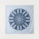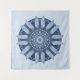 A beautiful feather mandala design tapestry in shades of blue and gray. Feathers and stones are repeated in a geometric pattern, placed on a background of concentric circles in shades of blue. Original art with hand drawn effect.