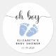 Cute sticker for your baby boy shower favors and correspondence featuring "oh boy" in a stylish script with swashes and a blue watercolor of baby feet. Underneath you can easily personalize with your name and shower date.