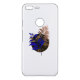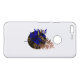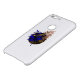 Asymmetrical, unusual, floral composition of gold and ultramarine, blue fern branch with black textured circle on white background. Fern branch.