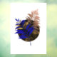 Asymmetrical, unusual, floral composition of gold and ultramarine, blue fern branch with black textured circle on white background. Fern branch.