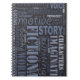 The front cover features fiction writing vocabulary that is arranged into word art. The design includes multiple fonts, set in various shades of blue.