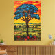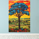 Under a blazing sky, a tree with turquoise-blue leaves stands majestically against a golden landscape. A vibrant, surreal artwork radiating strength, magic, and untamed nature—perfect for transforming any space with energy and bold color.