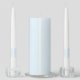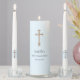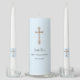 Personalized First Holy Communion Candles featuring pastel blue background and gold crucifix. .