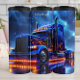 This image features a powerful blue semi-truck with vibrant orange flames painted along its sides and glowing orange lights along its bottom. The truck is positioned on a wet, reflective surface that mirrors its lights and the swirling blue and purple cosmic night sky filled with stars in the background.