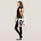 A tote bag with a blue fleur-de-lis print great for doing your shopping, book bag, or carry work items.