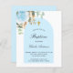 A white background decorated with eucalyptus greenery, a light blue rose, and golden leaves and a blue arch frame. Personalize and the childs name and ceremony details. Elegant hand lettered style script.