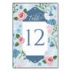 This wedding table cards seating plan features a light blue art deco aesthetic with charming pink roses and wildflowers. Personalize this editable template with your own table numbers and wedding date for a cohesive reception look. Perfect for a spring garden or whimsical floral theme.