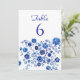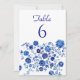 Direct guests with this classic table number card, featuring elegant navy typography above a rich blue floral border on a crisp white background. The bold botanical pattern adds a refined "something blue" accent that suits coastal celebrations, romantic garden receptions, and timeless blue and white wedding themes. Coordinate it with matching stationery and day of details to create a cohesive, polished tablescape.