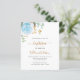 A white background decorated with eucalyptus greenery, a light blue rose, and golden leaves. Personalize and the childs name and ceremony details. Black and golden colored letters.