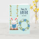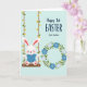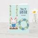 This card shows a white, human-like bunny with rosy cheeks and a wide smile, dressed in a bright blue tunic as it sits on a rustic wooden swing 🐰. The bunny’s relaxed posture and gentle tilt of the head give the scene a sweet, affectionate tone, like it’s sharing a quiet moment with someone close. Two swing ropes run straight down the left side, decorated with small yellow-and-white flowers and fresh green leaves that form a vertical floral trim. The background is a pale aqua wash, leaving lots of open space that keeps everything light and airy. In the upper right, the greeting “Happy 1st EASTER” appears in large blue letters, with a smaller line beneath that reads “Great Grandson” in matching blue. The text is right-aligned and spaced neatly so it sits comfortably above the artwork without crowding it 🌷. In the lower right, a round wreath of blue flowers with bright yellow centers and green foliage adds a balanced finishing touch.