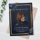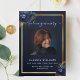 An elegant tri-fold program. A navy blue background, a faux gold frame, blue florals and space for a photo. Personalize and add name, dates and your text.