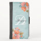 Cover your new iPhone with this beautiful, trendy, feminine case. It is decorated with a floral border on a blue watercolor background and your name and monogram in the middle. The vibrant colors include coral, pink, blue, gold on a blue watercolor background. A monogram template has been added so you can personalize this case with your name and initial.