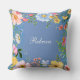 Pretty blue throw pillow - available in different sizes and fabrics, that you can personalize with your name, features a lovely, colorful floral border all around the edges.