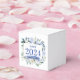 This graduation favor box features blue and white watercolor florals on the front with a place to add a graduation year. The front has a place to personalize with a name over a watercolor swash. There is a faux gold confetti accent near the name.